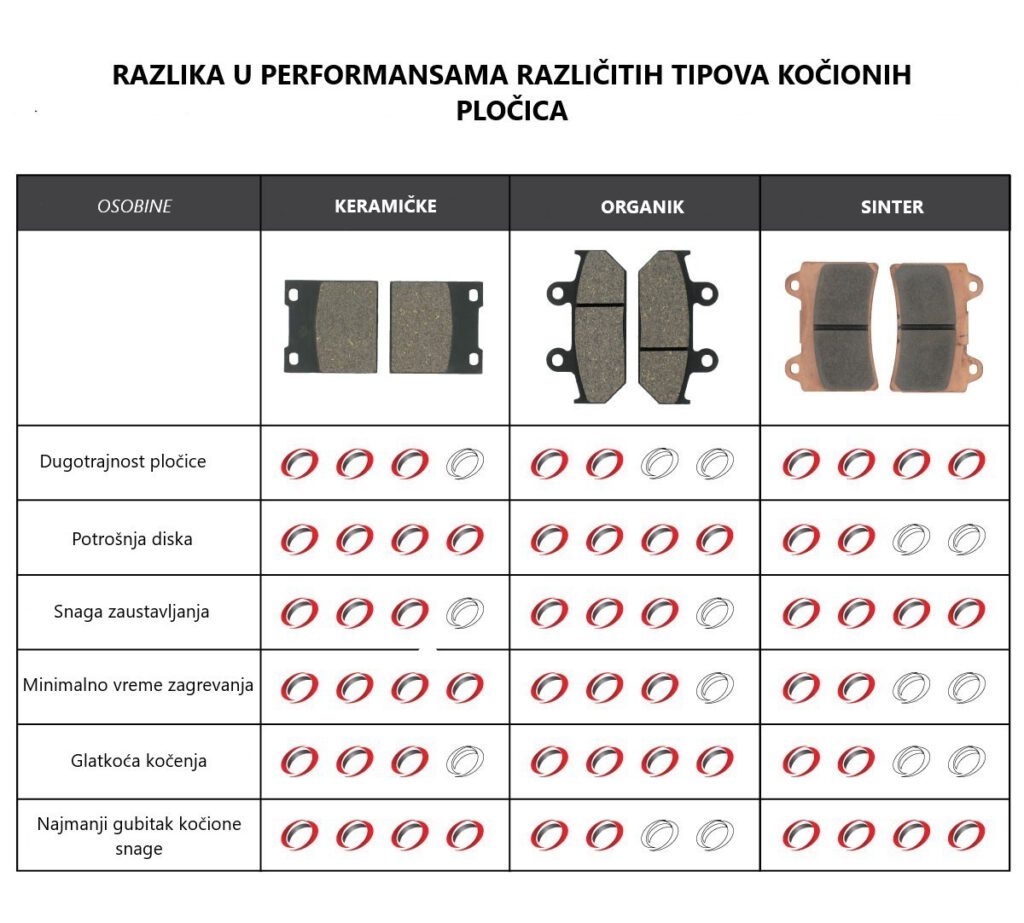 Prema ovome birate kakvu smesu materijala želite na svojim pločicama. Najčešći izbor su sinter pločice za uličnu vožnju, kao i za agresivniju vožnju na otvorenom putu ili na izlasku na stazu. Organik pločice se zbog svoje niže cene često koriste za zadnji točak, ali i na manjim motociklima kojima nije potreban snažan ugriz već kontrolisano kočenje i dobar osećaj. Polu metalne pločice su odličan kompromis između dva sveta i trebale bi da pružaju sličan ugriz kao sinter sa boljim osećajem koji pružaju organik pločice, ali ovo zavisi od proizvođača i od smese koje koriste. Najbolje je da isprobate više vrsta i proizvođača dok ne pronađete tačno ono što vama odgovara i vašem stilu vožnje.
